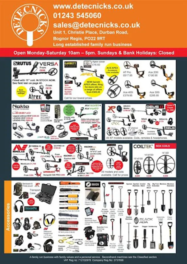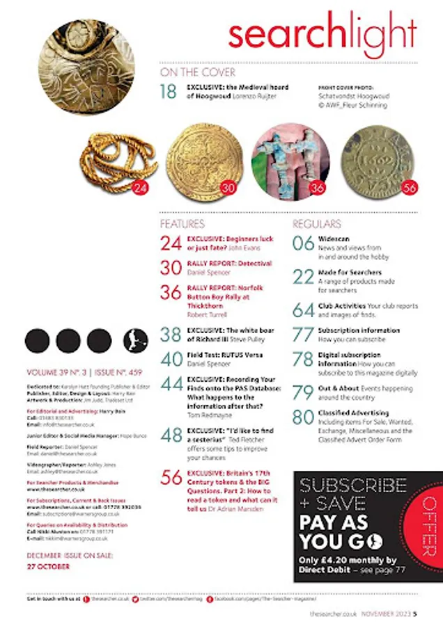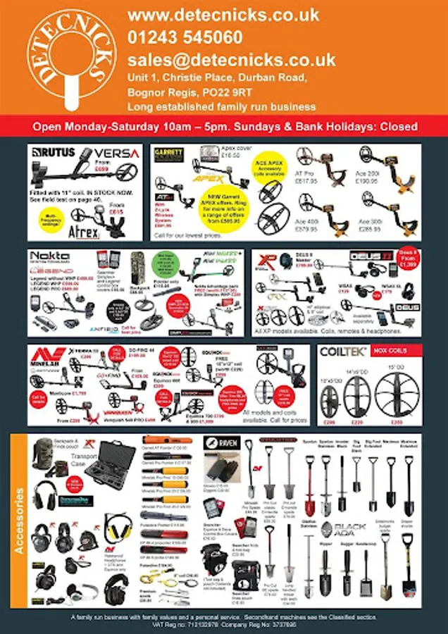 A monthly metal detecting magazine which is full of: the latest discoveries, finds Identification and valuations, news and views, collections, detailed finds articles written by experts, field tests and detecting tips, research and club news.