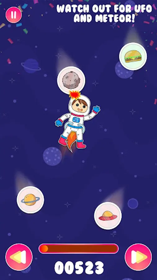 This interesting, fun and colorful game was created for all pioneers. In it, your astronaut will have to collect his own food for survive and plow the expanses of immense space on it. But your flight will be very difficult. In space, you will be trapped in many surprises and dangers.