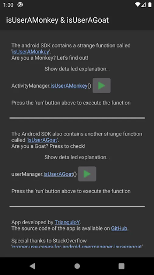 The source code of the app is available on GitHub (https://github.com/TrianguloY/isUserAMonkey).