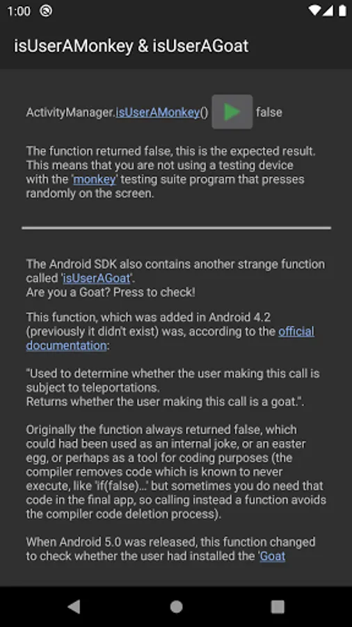 Did you know that in the Android SDK there is a function called 'isUserAMonkey' and another called 'isUserAGoat'?