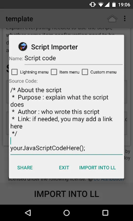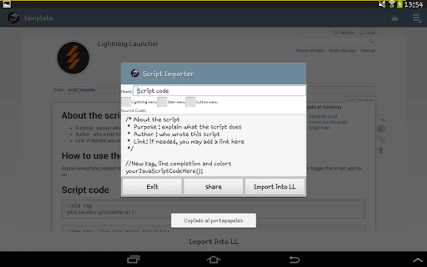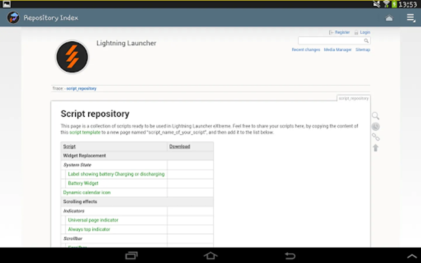 This app consists of a web viewer that lets you navigate through the wiki script repository of Lightning Launcher. When you are on a script page, click the download button and import it (optionally send it as text)