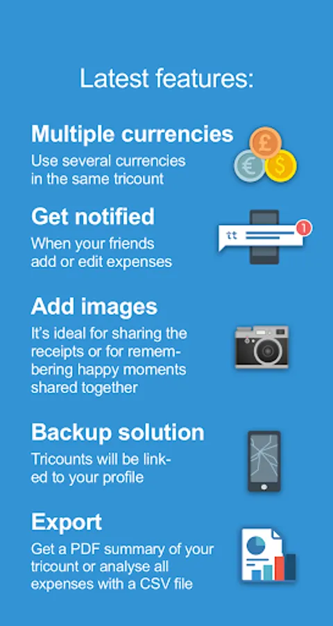 Very useful for any activity with friends and colleagues: holiday, city-trip, flat sharing & flatmates, week-ends, everyday lunch with colleagues, parties, etc. In your couple, you can create a tricount to know who has paid what this month, or on holiday.