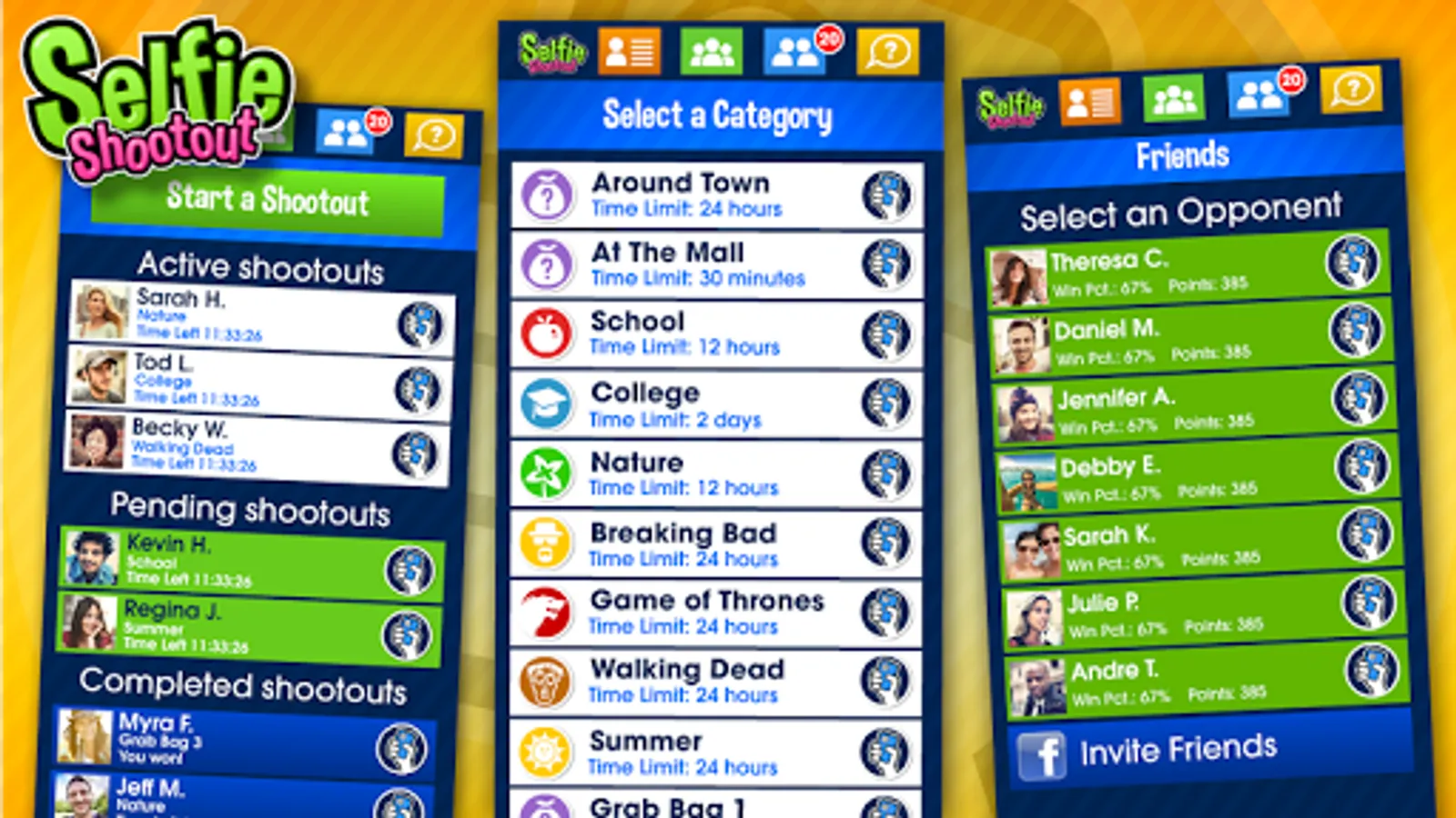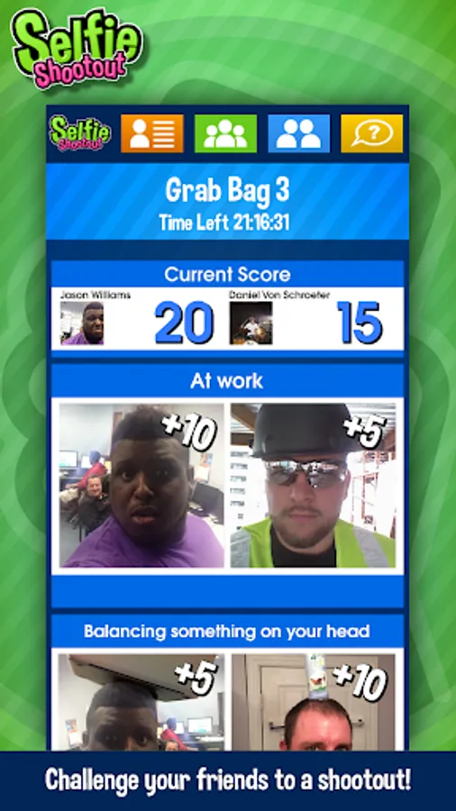 Selfie Shootout is the free game that'll put your selfie skills to the test. Go head-to-head against your friends as you tackle selfie challenges and rack up points!