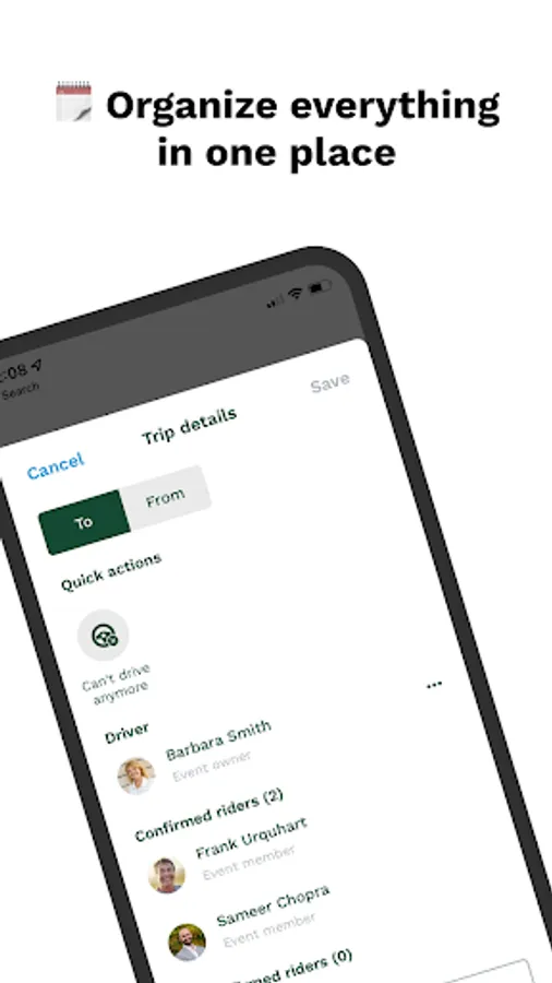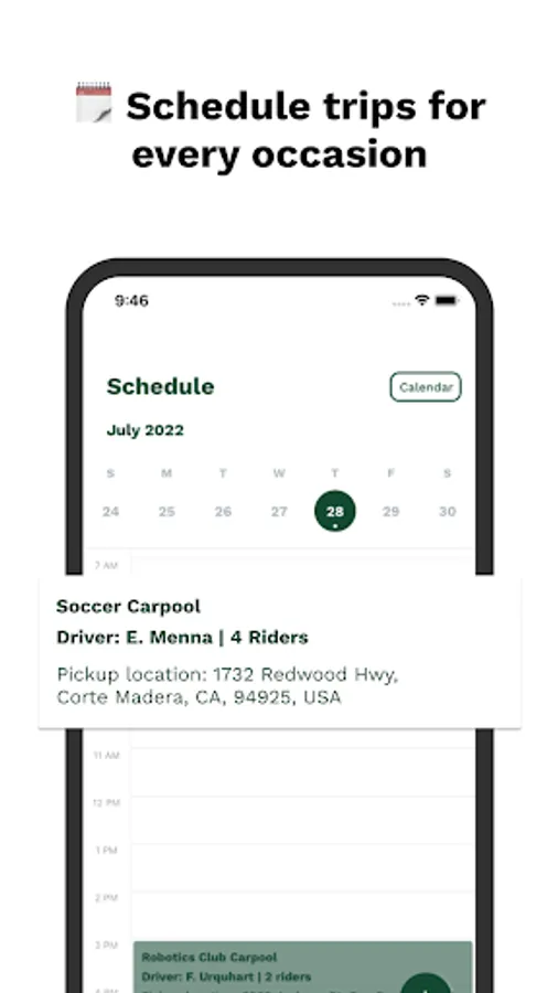3. Schedule and Ride — See who’s driving, who’s riding, the pickup location, and time. Schedule repeat trips or for single days.