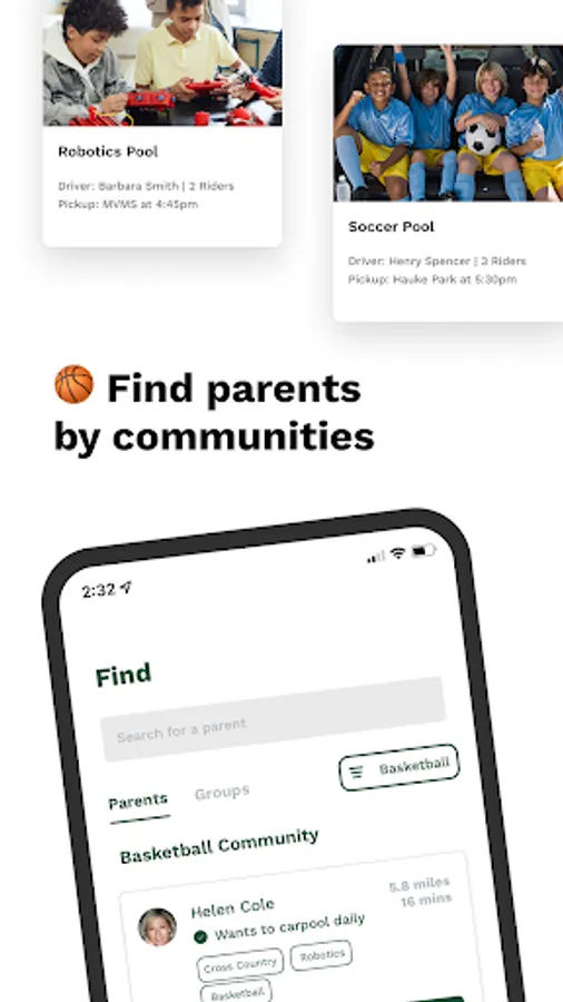 1. Find — Easily see which families live closest to you and what school activities they participate in.