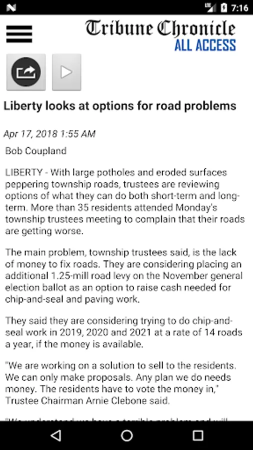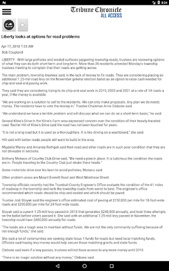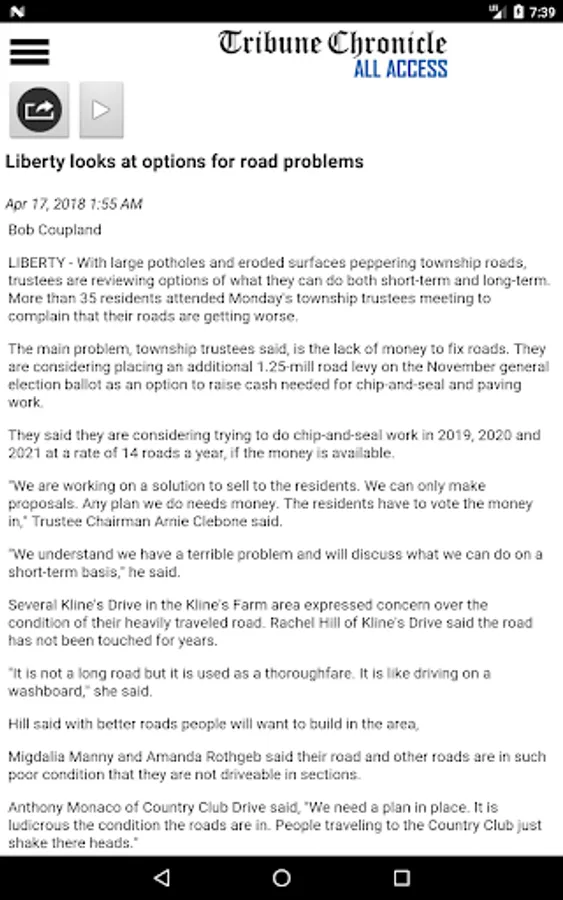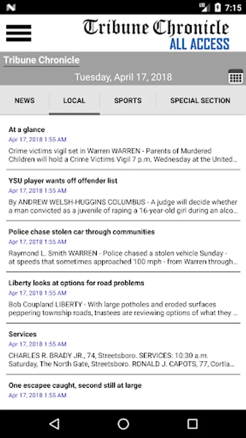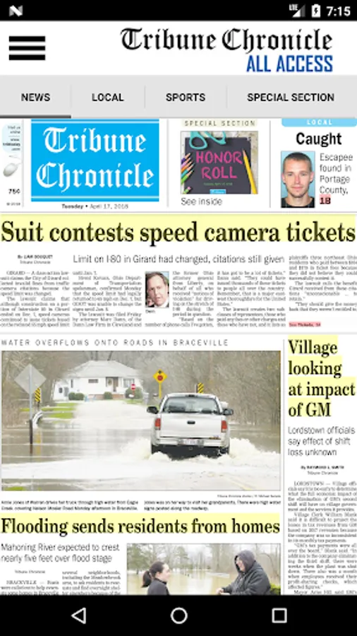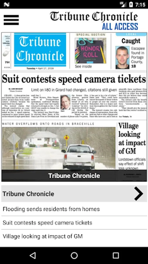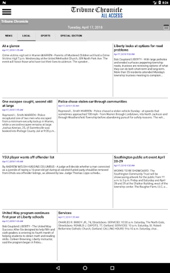 Stay on top of news from Warren and surrounding areas by receiving the full print version of the Tribune Chronicle on your Android device. Every page of every edition is delivered to your device. The Tribune Chronicle is the best source for local and national news, sports, weather and features in the Warren and Trumbull County area. Download the app to view the printed pages of the newspaper or read headlines and stories along with related photos in a built-in story viewer.