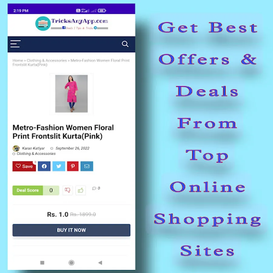 TricksAnyApp Deals & Offers - The Smartest Deals, Latest Deals,Coupons, Offers And Events application providing curated deals, best bargains, promo codes, offers, freebies, cashback offers from various online sites including but not limited to Flipkart, Paytm, Pepperfry, Myntra, Shopclues, Snapdeal, Jabong, Tatacliq, NNNow and much more across various categories like Deals on Mobiles , Electronics, TV, Refrigerators, Clothing, Beauty & Health, Baby Products, Recharges, Grocery & Stationery, Travel & Cabs, Food & Restaurants and many other.