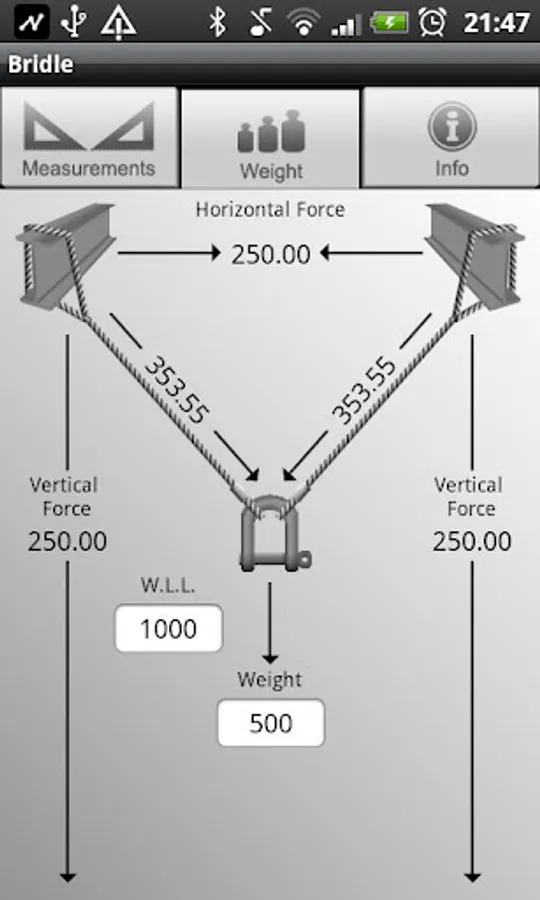 Imagine that you get to a location to build a set and you need to calculate the bridle length and weight distribution of a two point rigging bridle. That’s were Bridle comes in handy! Bridle is thé rigging App for Android which can easily do all those calculations for you. Just simply put the values in the correct fields and it will automatically calculate the rest for you.