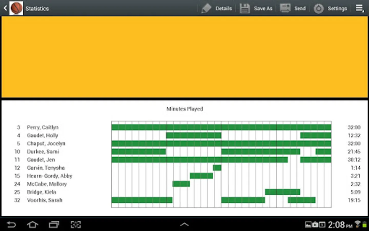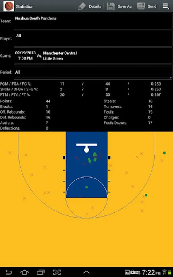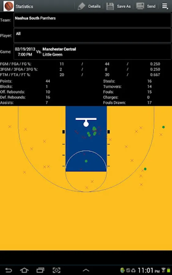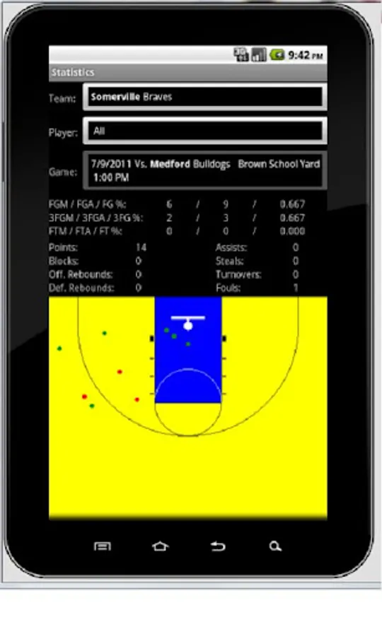 The application requires permission to write to your SD card to create files containing statistics in CSV, HTML, and MaxPreps TXT formats and shooting charts in JPEG format that can be saved and later sent through email.