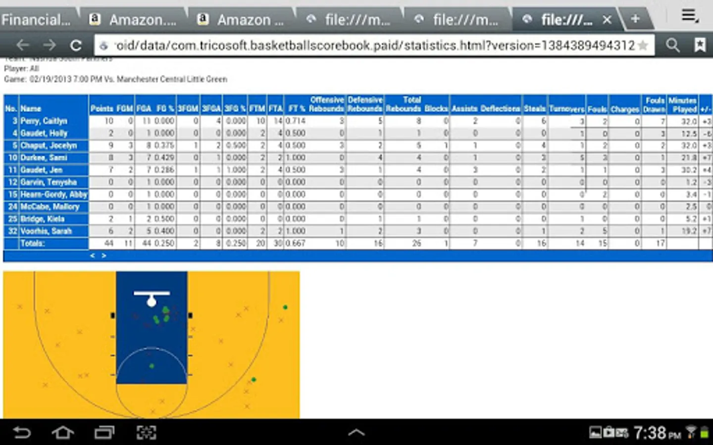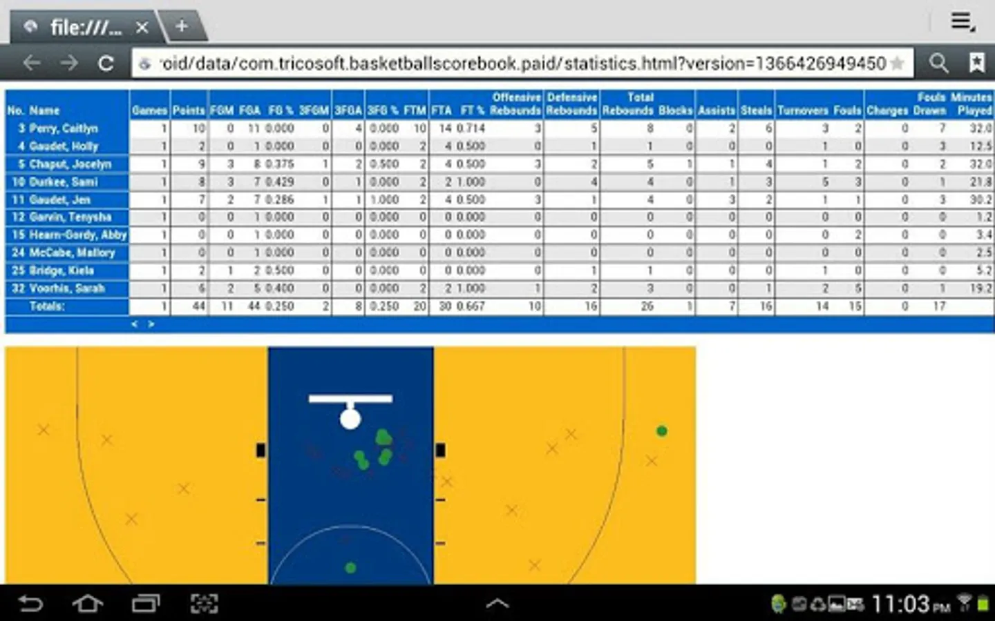 Basketball Scorebook is a comprehensive hand-held basketball scoring system. Basketball Scorebook allows you to score and gather stats for basketball games as they are played. Game stats and shooting charts are available for teams, players and games by team, player or game. Score keeping has never been easier.