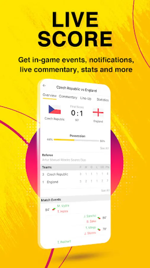 Get in-game events notifications, live commentary, player statistics, match statistics, league statistics, line-ups, head-to-head, fixtures, standings and much more.