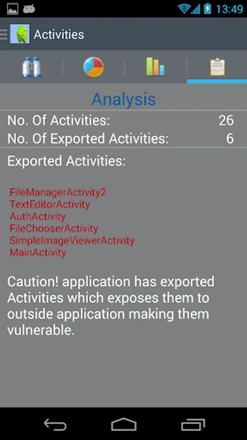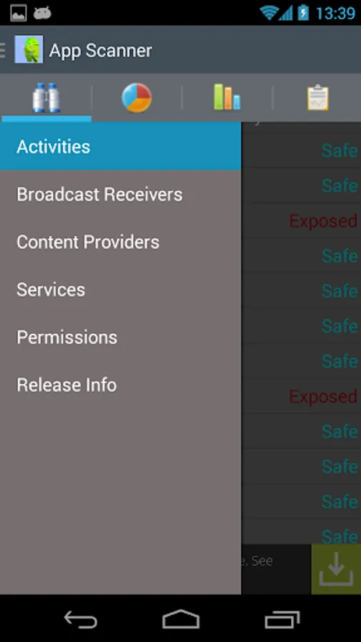 3. Once you select an application, App Scanner scans the application to give the results. Slide the screen towards right or press upper left icon present in App Scanner application to see the results for every Component.