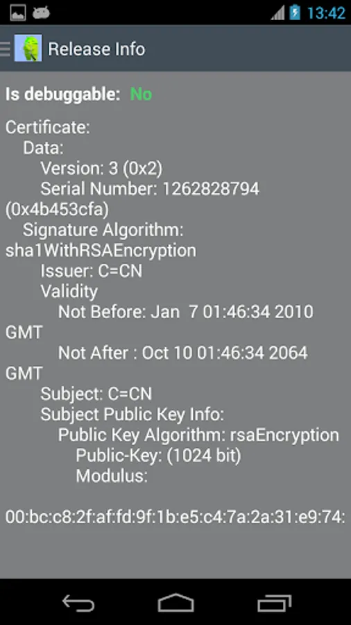 It also helps you identify all the Permissions used in an app and the Certificate used to sign the app.
