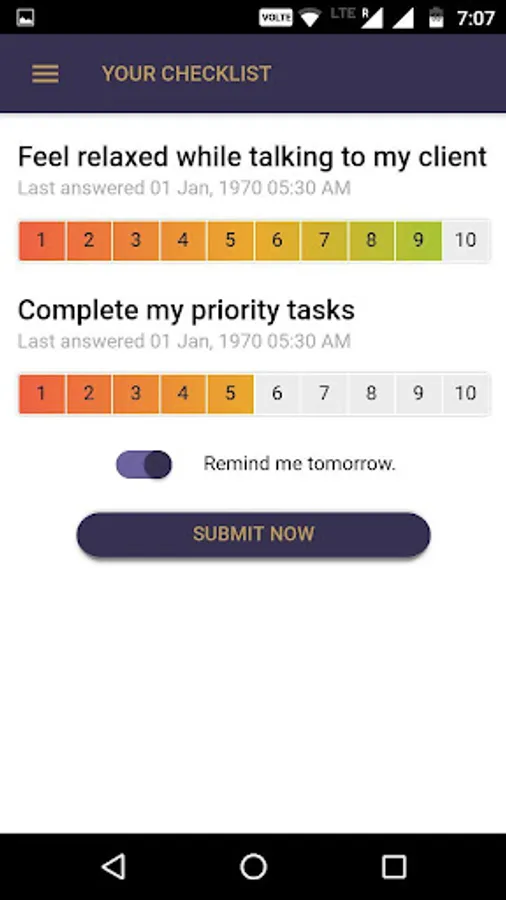 Rate yourself on the scale of 10 for your efforts to achieve the same, you can set the frequency at which you are asked to rate yourself. Track your progress on every checklist question since the beginning and focus your attention as needed.