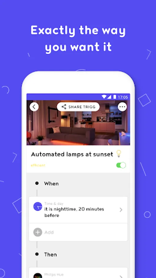 Set the mood by one press of a button. Make Sonos play your special Spotify playlist and automatically put your Hue smart lights in just the right setting. Or always turn the volume of your speaker up when the washer is in program. But it’s also for practical use such as notifying the whole family by playing a song when it’s dinnertime and everyone is connected to wifi.