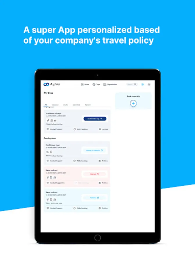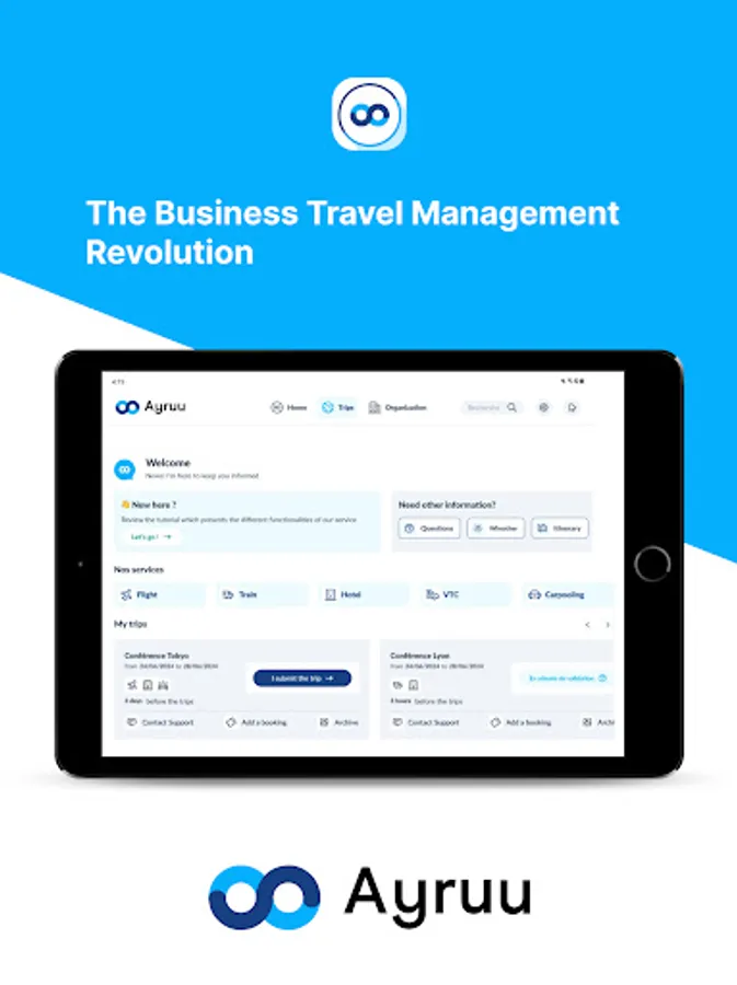 Ayruu, the mobile aggregator for businesses, revolutionizes your travel by centralizing bookings (flights, trains, hotels, car hire, taxi/vtc, car sharing, and much more), payments, invoicing and statistics.