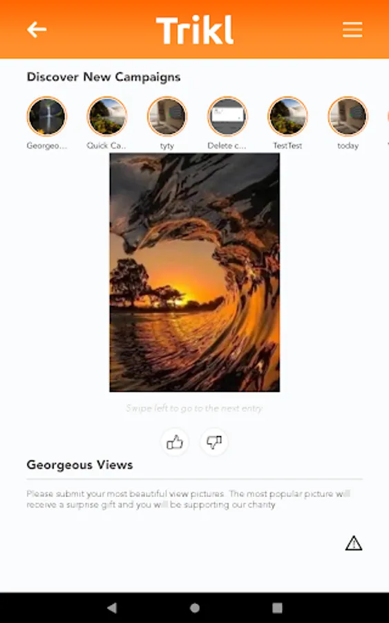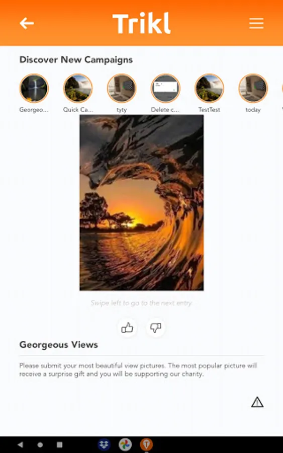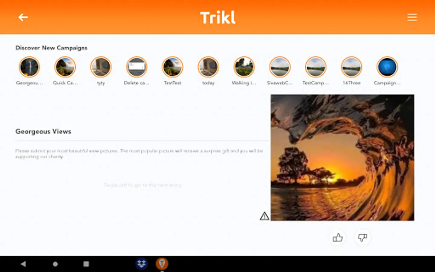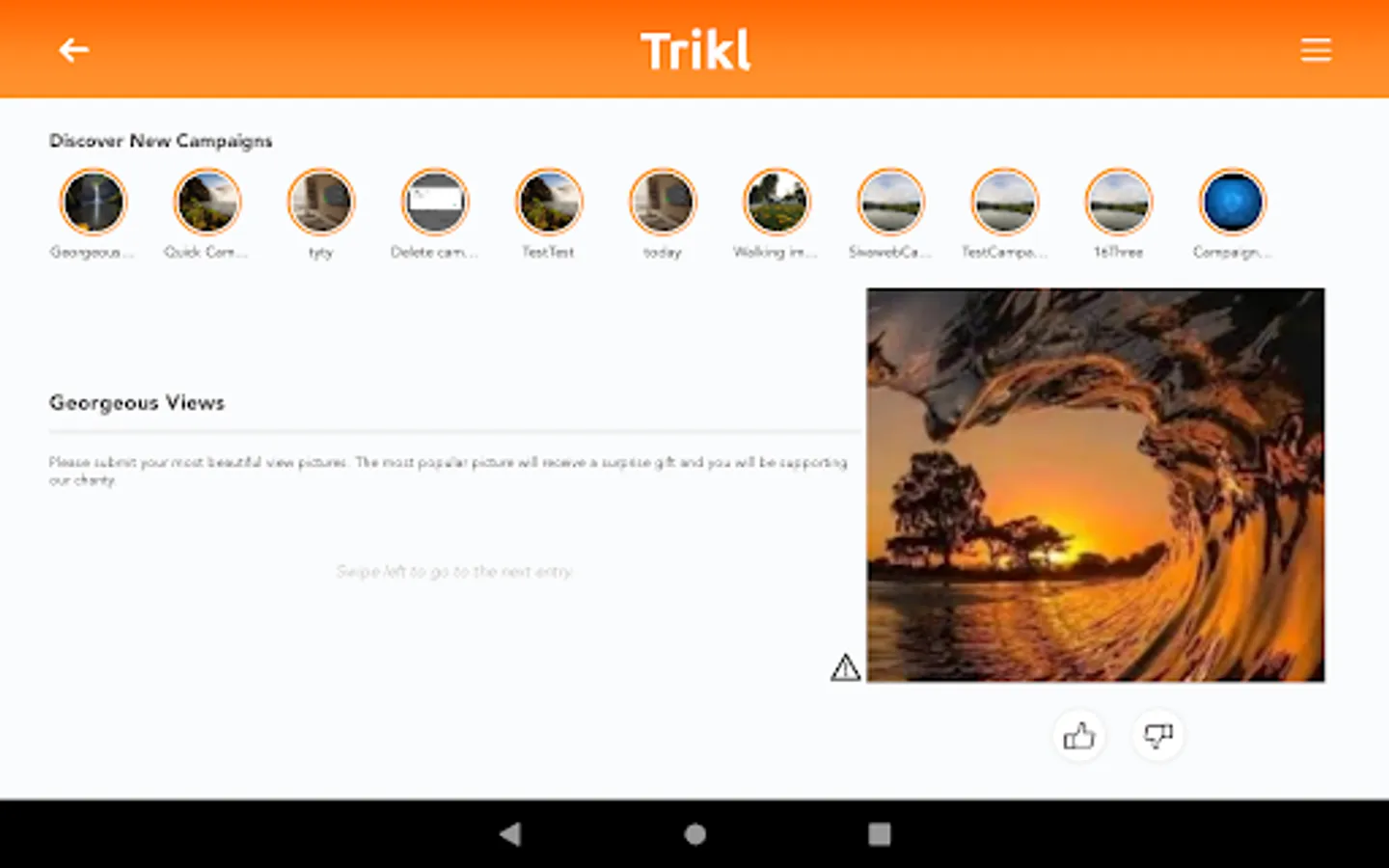 Trikl users have the ability to create and share photography and videography contests with their own community, as well as the public Trikl community. Due to the social nature of the app, Trikl allows users to not only share their contests with friends, family, etc. through their other social media platforms, but their individual submissions as well. Contest creators also have the ability to offer prizes for winners of their contests, if they so please, which are outside of Trikl’s management/oversight. For example, a contest creator may offer to send a gift basket or another prize to the top contestant. All submissions of a particular contest will be voted on in order to deem who the winning contestants will be. Users will also have the ability to search for contests that they may be interested in by use of a search bar on one of Trikl’s home screens. Trikl’s contests do not use the element of chance and the winner(s) of a particular contest are selected based on their merit and skill. Each contestant will submit their content in line with a contest theme/description determined by the contest creator. A contest creator also has the ability to add “sponsors” on their contests to promote and increase the amount of contestants that may submit for their contest.