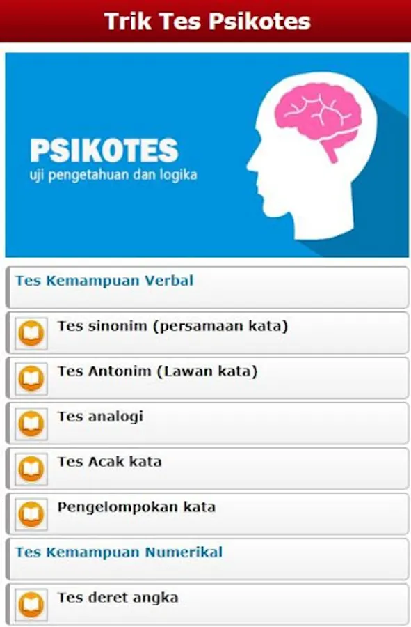 This application provides a variety of common Psikotes Test as Test equation, Test Series, Numeracy Tests Quick, General Logic Test, Test Picture, Verbal Analogies Test and others.