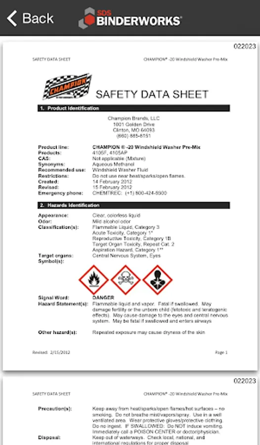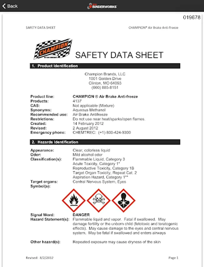 Unparalleled update process – With the push of a button, update your saved company SDSs to the most current version available in your SDS BinderWorks account.