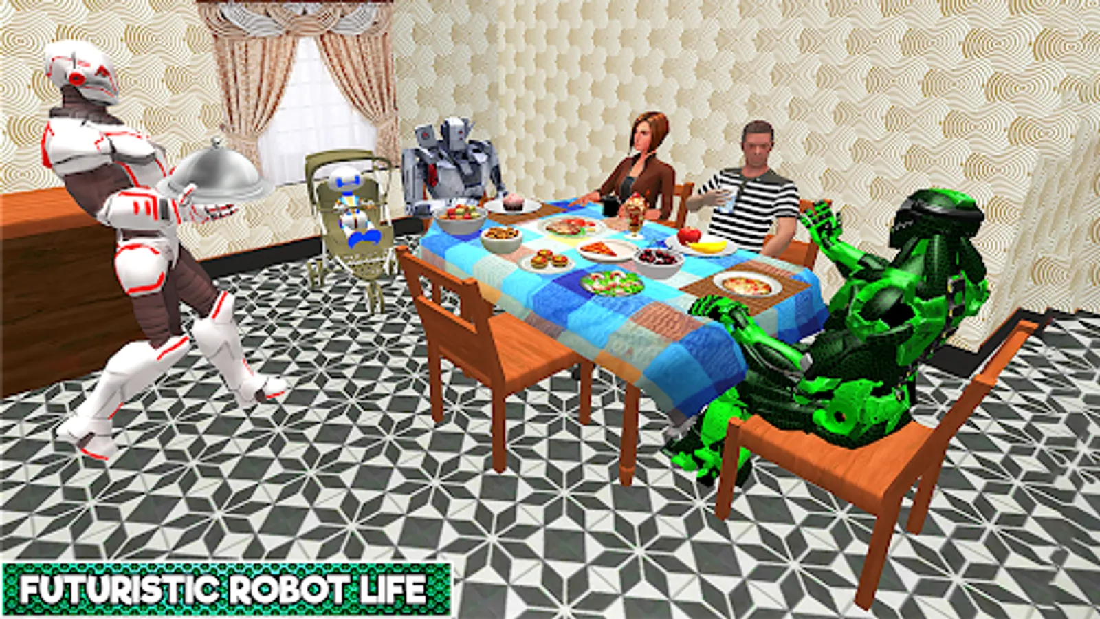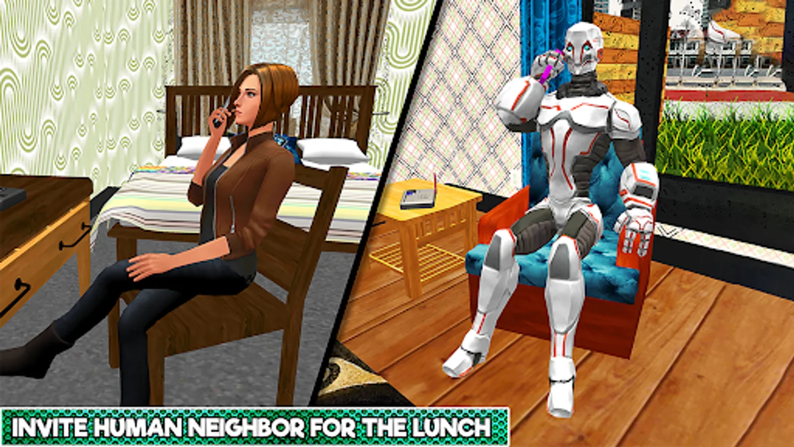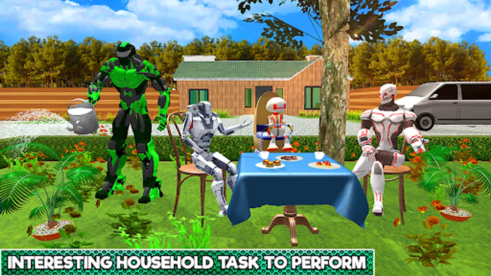 Play the role of virtual robots in human area and adopt the way of human living in Robotic Family Fun Simulator. Fabulous task to play in this virtual robotic game like, invite human neighbors for the lunch using your smart phone. Cook delicious food for the guests. Help the road cleaner by picking up the van with your robotic power so that he can easily clean the area.