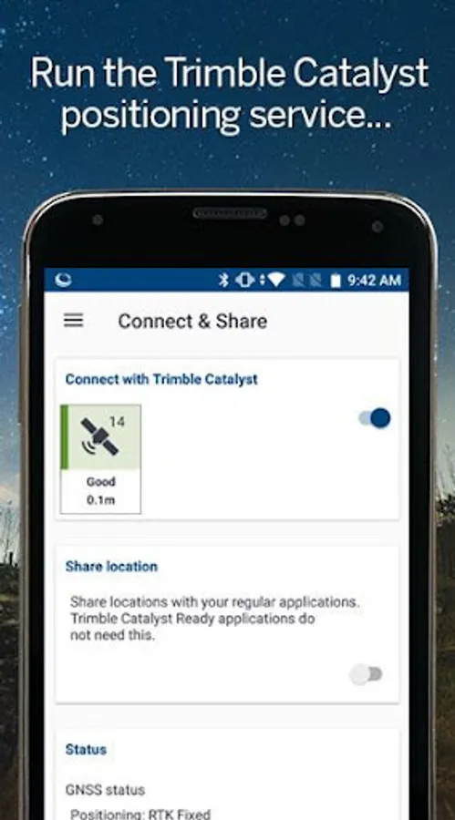 In conjunction with a subscription to the Trimble Catalyst™ GNSS positioning service, use this app to connect to and configure your Catalyst softGNSS receiver, monitor the status of the subscription, and control how GNSS positions are accessed or shared with other location-enabled apps running on your phone or tablet.