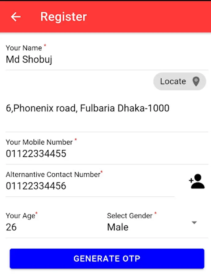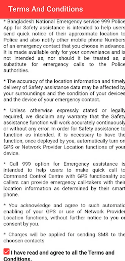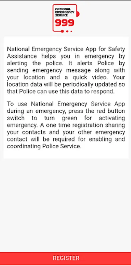To use National Emergency Service (BD 999) app during an emergency, press the red button switch to turn green for activating emergency. A one-time registration sharing your contacts and your other emergency contact will be required for enabling and coordination Police Service.
