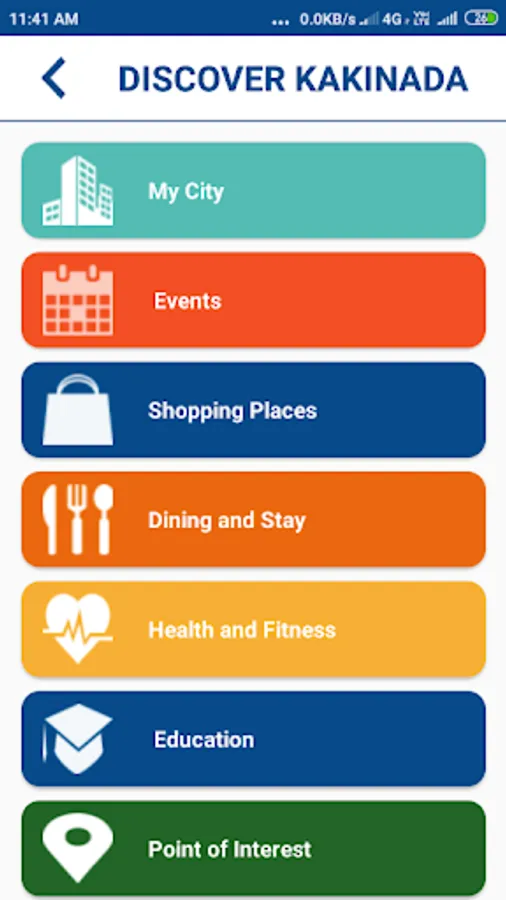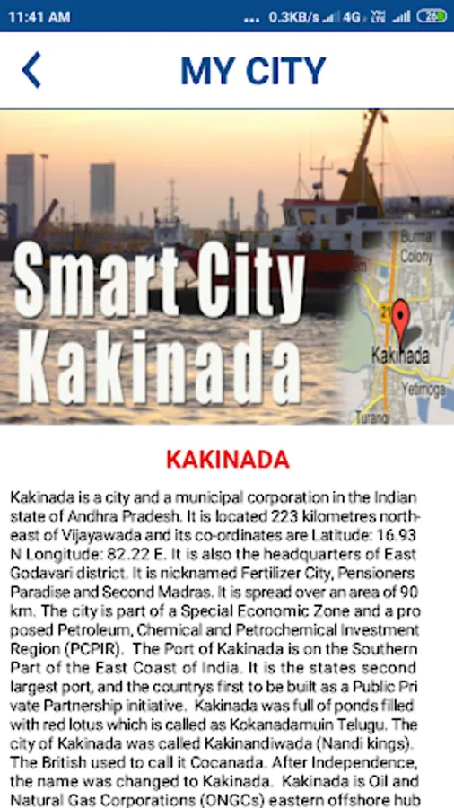 Its smart City App for Kakinada city in Andhra Pradesh, Feature Available are Discovering Kakinada, Finding Places Of Interest, Information about City Administration, Bus, Air & train time Table, City helpdesk.