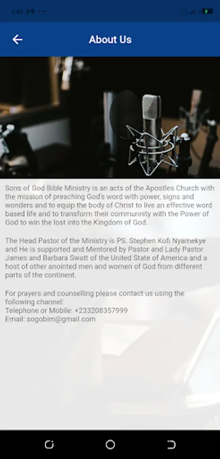 This is the Official Android app for listening to the English stream from Sons of God Bible Ministries. Sons of God Bible Ministry is an acts of the Apostles Church with the mission of preaching. God's word with power, signs and wonders and to equip the body of Christ to live an effective word based life and to transform their community with the Power of God to win the lost into the Kingdom of God. The Head Pastor of the Ministry is PS. Stephen Kofi Nyamekye and He is supported and Mentored by Pastor and Lady James and Barbara Swatt of the United States of America and a host of other anointed men and women of God from different parts of the continent.