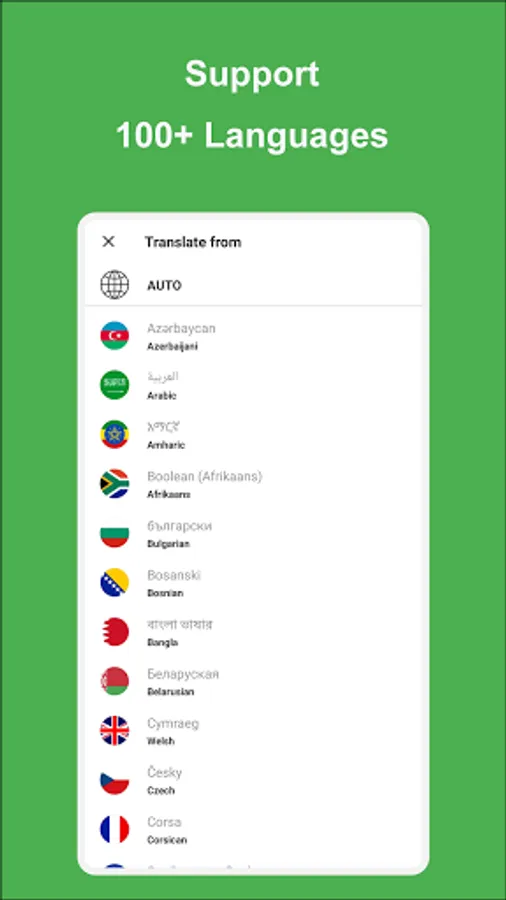 Afrikaans, Albanian, Amharic, Arabic, Armenian, Azerbaijani, Basque, Belarusian, Bengali, Bosnian, Bulgarian, Catalan, Cebuano, Chichewa, Chinese (Simplified), Chinese (Traditional), Corsican, Croatian, Czech, Danish, Dutch, English, Esperanto, Estonian, Filipino, Finnish, French, Frisian, Galician, Georgian, German, Greek, Gujarati, Haitian Creole, Hausa, Hawaiian, Hebrew, Hindi, Hmong, Hungarian, Icelandic, Igbo, Indonesian, Irish, Italian, Japanese, Javanese, Kannada, Kazakh, Khmer, Korean, Kurdish (Kurmanji), Kyrgyz, Lao, Latin, Latvian, Lithuanian, Luxembourgish, Macedonian, Malagasy, Malay, Malayalam, Maltese, Maori, Marathi, Mongolian, Myanmar (Burmese), Nepali, Norwegian, Pashto, Persian, Polish, Portuguese, Punjabi, Romanian, Russian, Samoan, Scots Gaelic, Serbian, Sesotho, Shona, Sindhi, Sinhala, Slovak, Slovenian, Somali, Spanish, Sundanese, Swahili, Swedish, Tajik, Tamil, Telugu, Thai, Turkish, Ukrainian, Urdu, Uzbek, Vietnamese, Welsh, Xhosa, Yiddish, Yoruba, Zulu