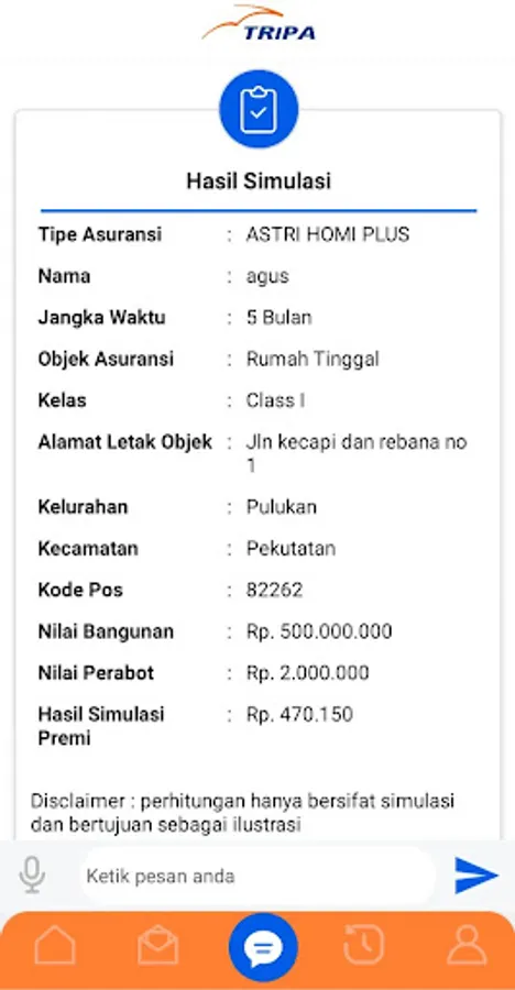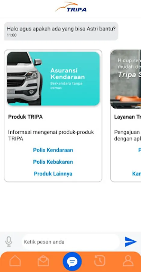 TRIPA Smart with Virtual Assitant "ASTRI" (ASIN TRIpa) is a Responsive and Integrated Mobile Application Solution (SMART) from PT Asuransi Tri Pakarta which is equipped with artificial intelligence (Artificial Intelligence / Ai) in the form of virtual assistants that can provide you the best service . TRIPA Smart provides a service with the concept of a solution to every need for insurance services with a digital automation platform for customers. This is in accordance with the Company's Motto, "Giving the Best".