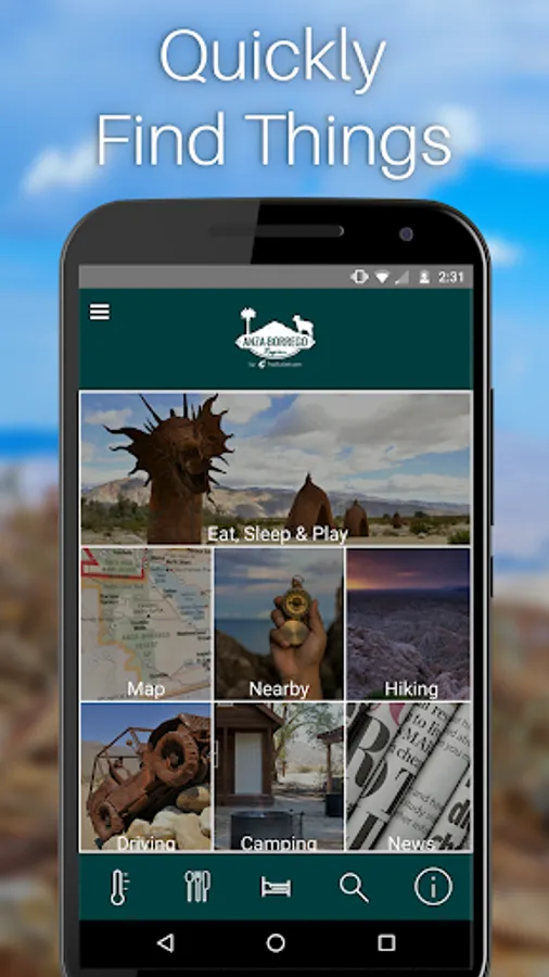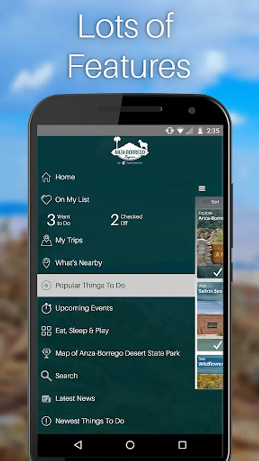The app uses advanced technology to guide users to popular destinations like Borrego Springs, Ocotillo Wells and the Salton Sea. Travelers have the opportunity to plan a trip, either on site or before their visit. The "Things to Do" option allows visitors to review all of the points of interest and add items to a "Want to Do" list. App users can then review their list when they arrive, and check off selected items when finished. Users can also add personal feedback and images to share with others via social media.