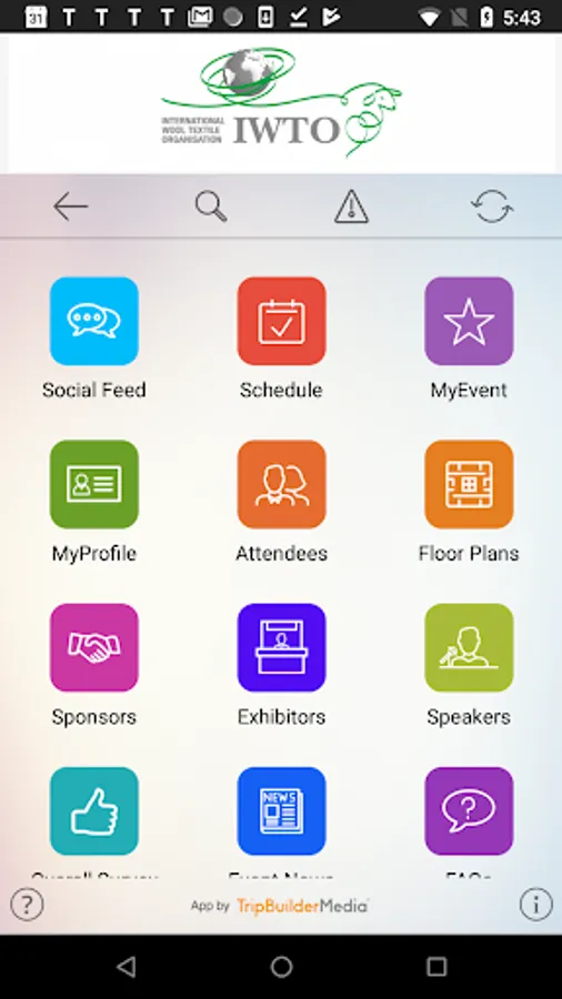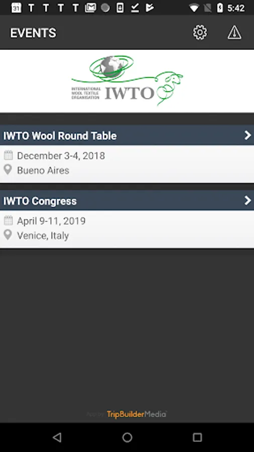 This TripBuilder Multi Event Mobile™ app is provided at no charge by the International Wool Textile Organisation (IWTO). It was designed and developed by TripBuilder Media Inc. If you have any questions, or need any support regarding how to use this app, please submit a Support Ticket (located within the Help icon in the app).