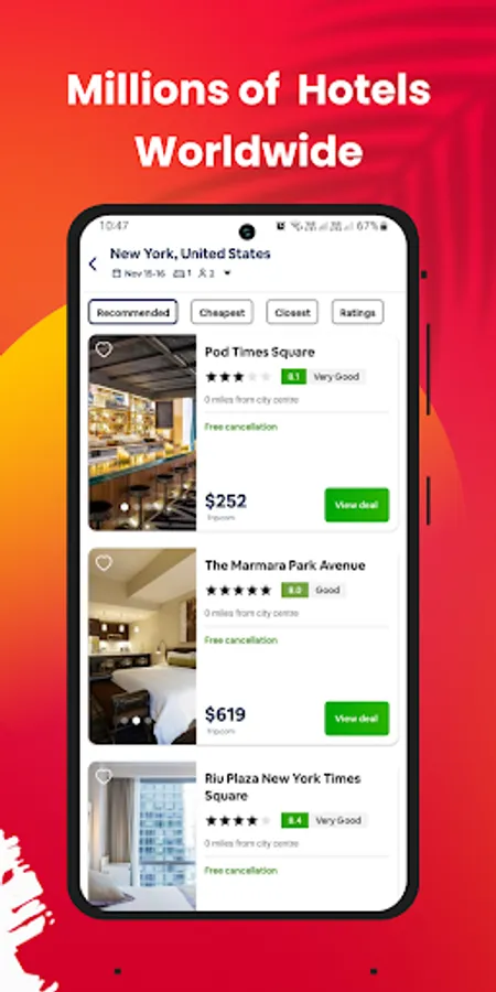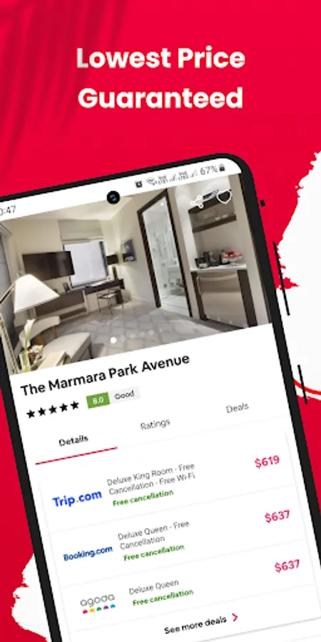 Hotel discounts app helps you reserve rooms at the best and cheap price online on hotel booking, and it should always be the lowest price. We deliver you the discounts and offers available worldwide for your stay. Our Hotel booking app compares prices among world-leading travel apps such as Airbnb, Expedia, Agoda, Priceline, Vrbo, OYO, Trivago, Orbitz, Travelocity, Booking com, Trip Advisor, Hotels com, Hotwire, Hotel tonight, and many more. So you can ensure the best and cheapest hotels reservation deals online. Also, find last-minute travel booking offers here.