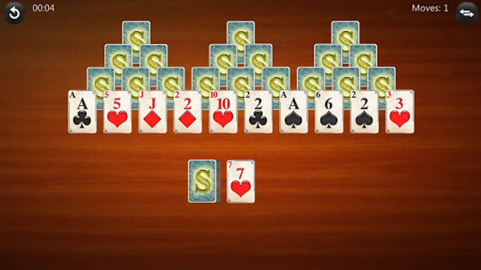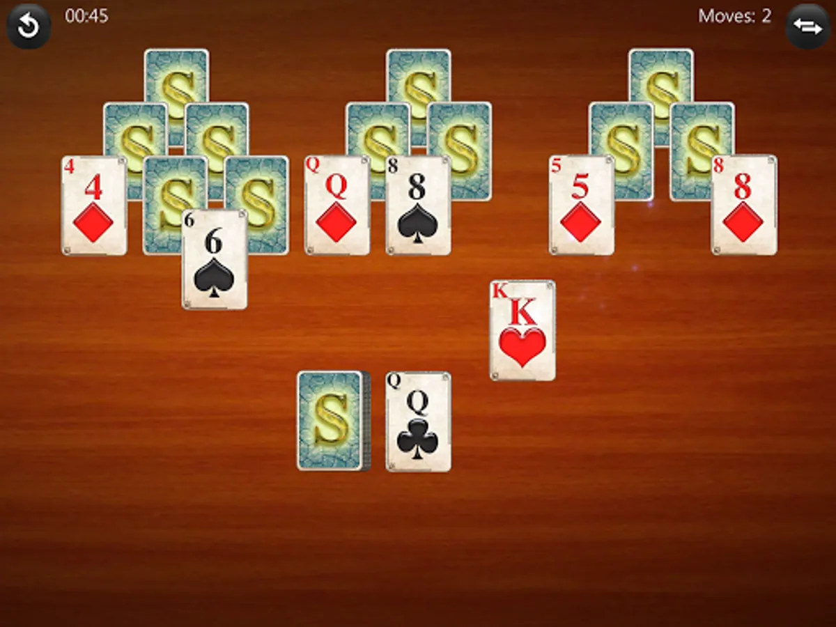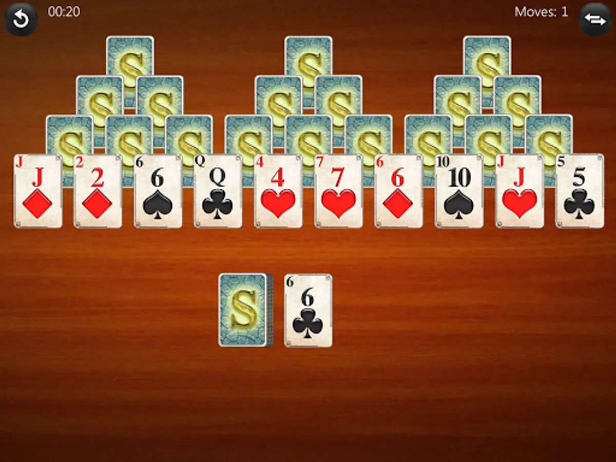 • Three Peaks: There are three peaks (pyramids), each one is 4 cards high. The peaks share the lowest level. The cards at the bottom are face up, the higher ones are face down.
