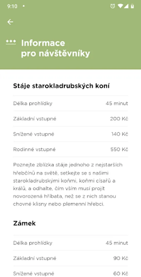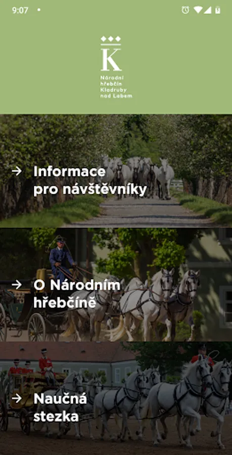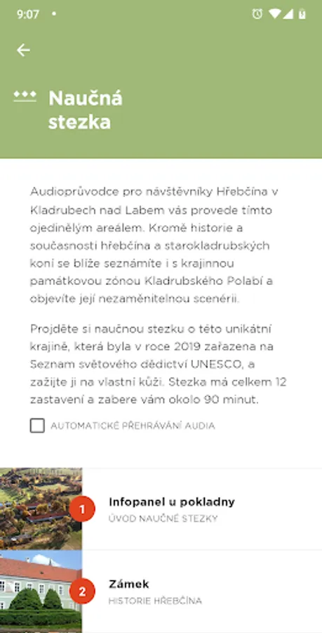 An audio guide for visitors of the National Stud Kladruby nad Labem will guide you through this unique area. In addition to the history and present of the National Stud and Old Kladruber horses, you will learn more about the Landscape Conservation Zone of Kladrubské Polabí and discover its unmistakable scenery. Explore the nature trail about this unique landscape, which was declared a UNESCO World Heritage Site in 2019, and experience it for yourself. The trail has a total of 12 stops and takes you about 90 minutes.