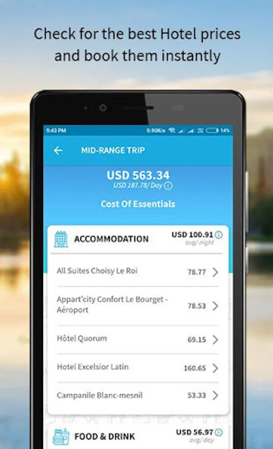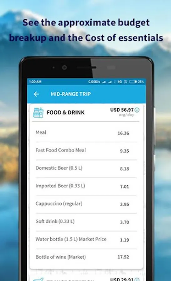 • Lists cost of essentials like bottle of water, combo meal, and taxi fare etc.