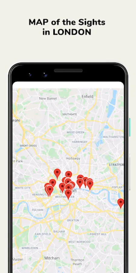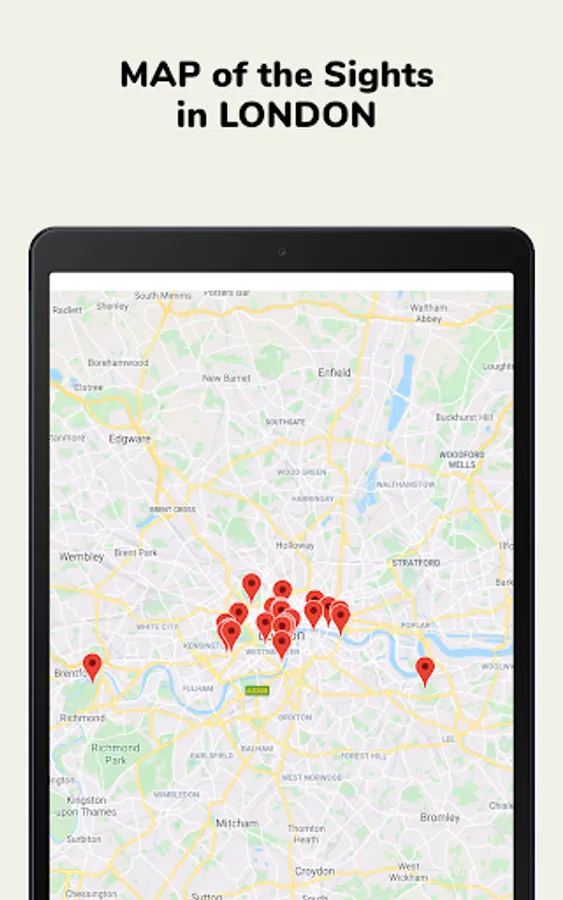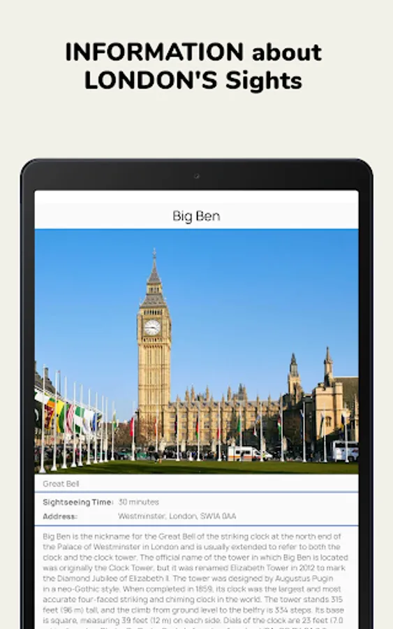 ✓ Search & Discover. The large database of London's sights (indicating the mode of operation, cost of visiting, contact details, brief descriptions of sights, photos and showing them on the city map).