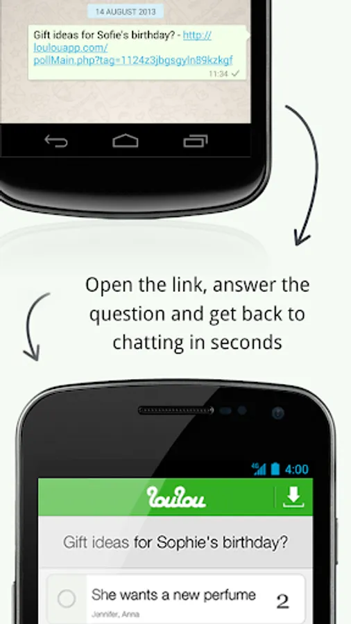 LouLou helps you keep your group chats clean and tidy when you and your friends want to make plans. No log-in required and straight from group chats in your favorite chat application!
