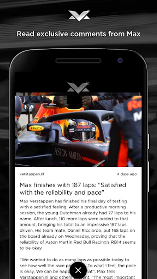 The Max Verstappen Official App is an exclusive mix of all content from Max’ world. This app allows you not to miss any official update from Max and brings you closer to Max Verstappen than ever before, making it a must-have for fans.