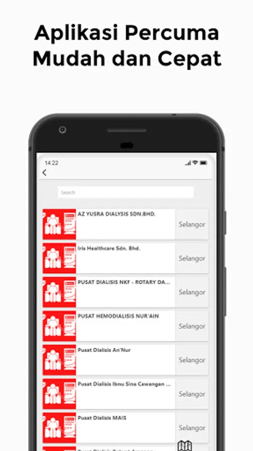 Aplikasi Pusat Dialisis menyediakan kemudahan membuat carian perkhidmatan Pusat Dialisis di seluruh Malaysia.