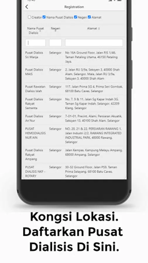 2. Carian Pusat Dialilis berdasarkan kata kunci (nama syarikat, bandar, jalan, dll).