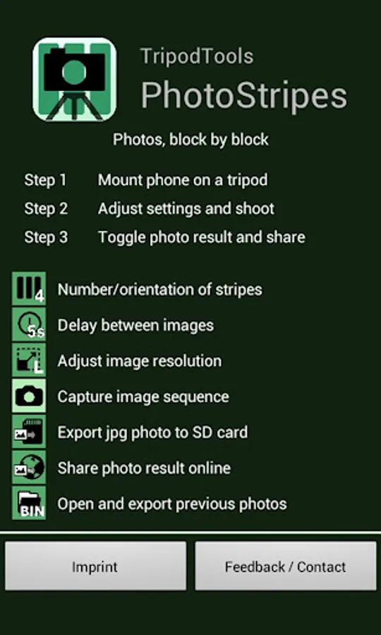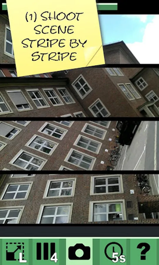 The app to use your Android camera in a new way! PhotoStripes helps you to create photos that represent a scenery stripe by stripe, with each stripe showing a different point in time. Between 4 and 8 such stripes can be selected, arranged horizontally or vertically within the final image, and stripe-to-stripe intervals can be set between 5 seconds and 5 minutes.