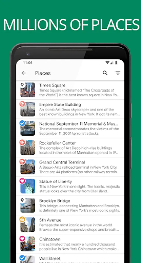 Popular places come with descriptions, photos, opening hours, admission fees, links and additional data written by professional travel editors or sourced from Wikipedia and other databases.