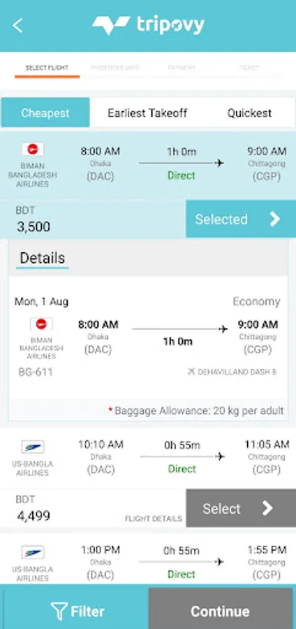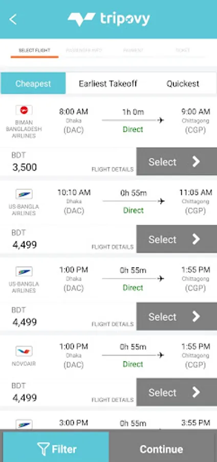FILTER - See and filter flights that only match your price range. Also filter your preferred airline.