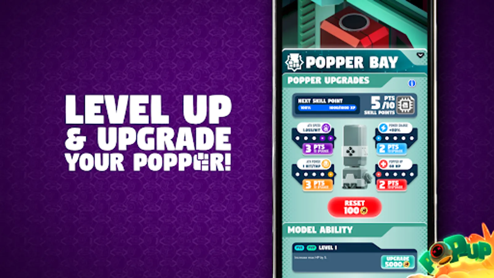 Level up and upgrade your Popper to gain advantage against enemies in terms of speed, durability and power.