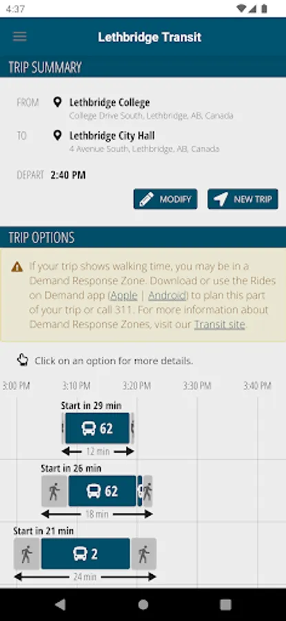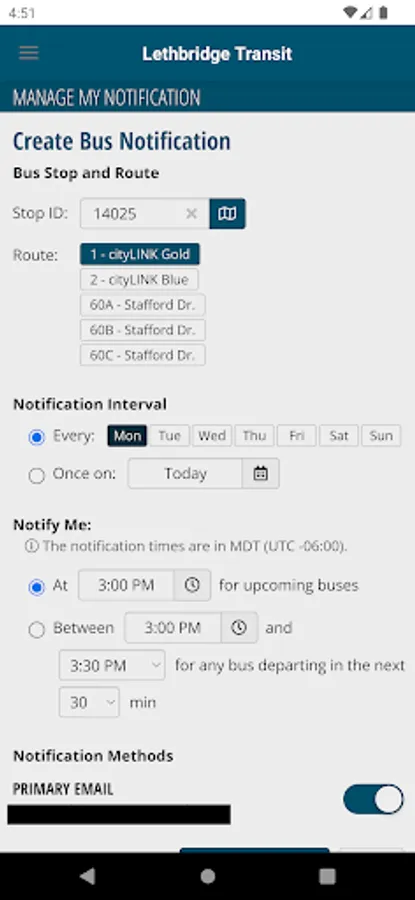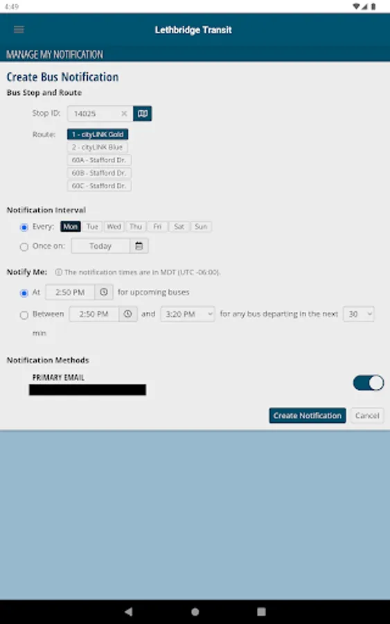 Create a Lethbridge Transit account and customize transit text, email or push notifications. Arrival notifications are fully customizable and can be setup for any and all days of the week. The times can be set to a specific time or an arrival window. The arrival notifications will ensure you receive the information you need regarding your bus.