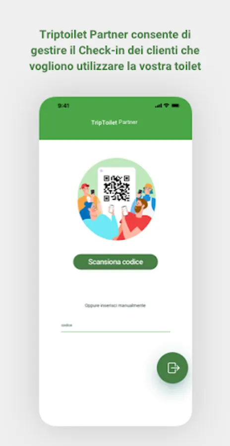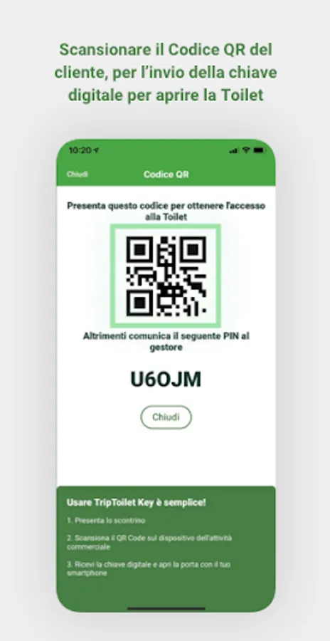 The Triptoilet KEY service allows the Customer to access the toilets, in complete autonomy, by receiving the digital key on their Smartphone via a scan on a device located at the cash desk, on which the Partner can install this App.