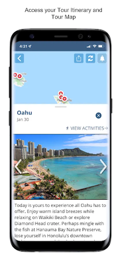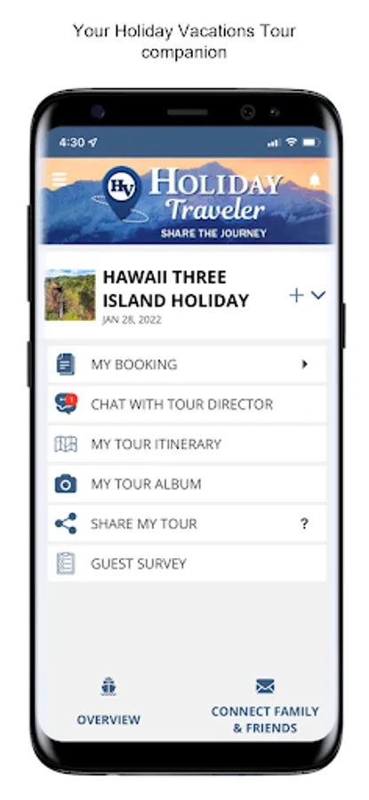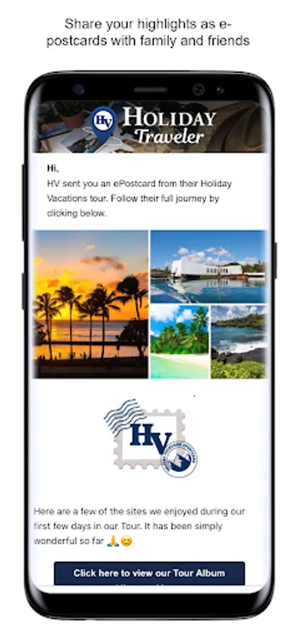 The Holiday Traveler App also keeps you up-to-date with any last-minute changes to your tour, to flights, or to any other key aspect of your vacation. It also allows you to communicate directly with your Tour Director. You can also easily share your tour highlights with friends and family by sharing photo updates via attractive email postcards.