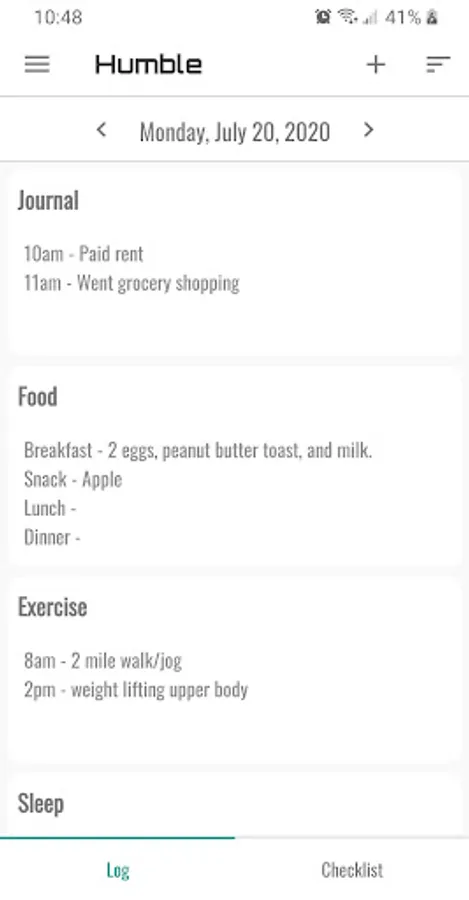Humble is a fully customizable productivity and journaling app. It has the option to add a Log or Checklist for an individual day, or also the ability to use the master files to create a Log/Checklist section that repopulates every day automatically. You can check items off your list daily, or just add something just for the moment. You can add, delete, and update entries. Switch between normal and dark mode themes. There is multi selection and also custom sorting with drag and drop functionality. When it comes to creating your custom view, it is completely up to you on how you build it. Every log and checklist is custom made by you and will look different for every user as we all have different needs and things we want to track. Data is stored locally on your device. There is no login required.