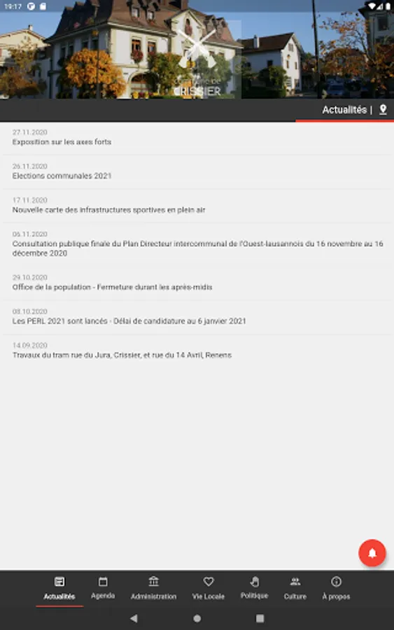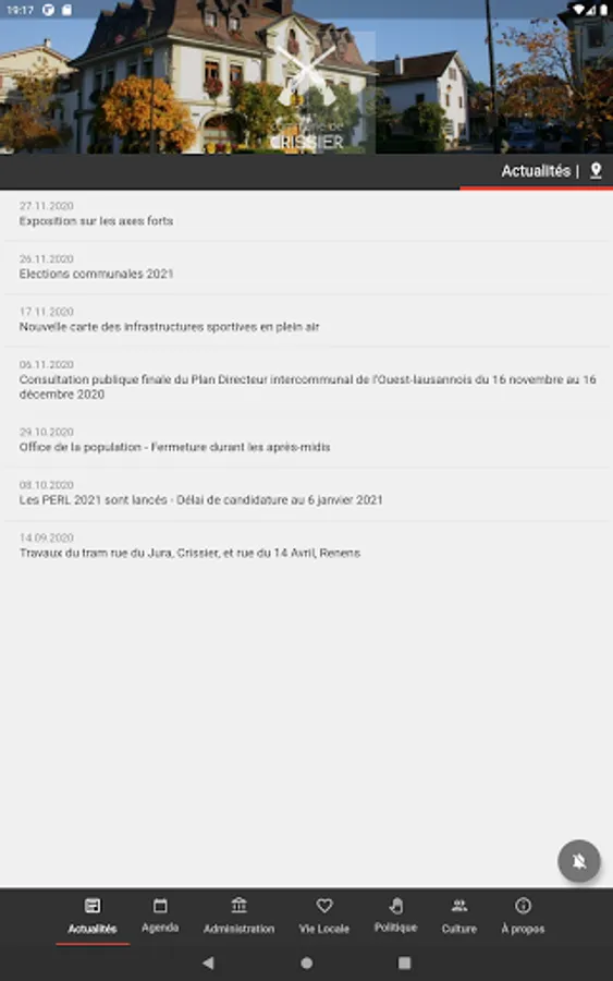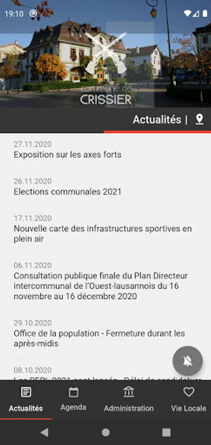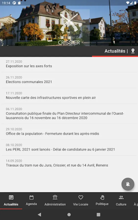 Receive notifications when the latest news and dates are published by the administration of the Municipality of Crissier. You also have the option to disable them from the app itself.